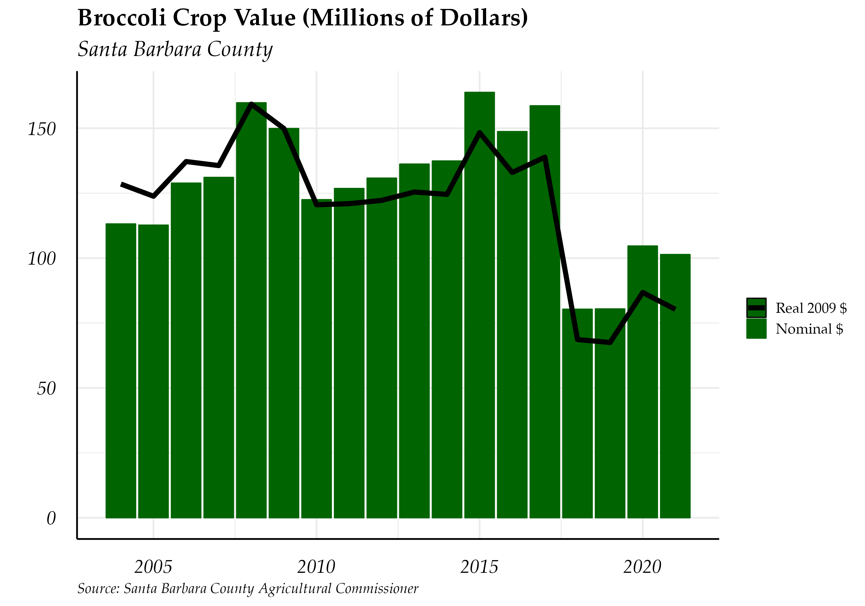 Broccoli’s crop value declined in 2021, decreasing from $104.654 million the previous year to $101.371 million. The 3.14% decrease in gross value reversed the trend from the previous year, when the value of the broccoli crop grew by 30%. Total harvested acres of vegetables, the category that includes broccoli, decreased by -3.79%.
