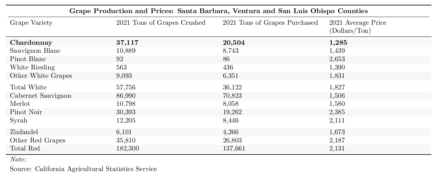 In Santa Barbara, Ventura and San Luis Obispo Counties, the average price of white wine grapes in 2021 was $1827.11 and the average price of red wine grapes was $2131.71. The average price of grapes in the Central Coast region is typically higher than the statewide average. Production of red wine exceeds production of white wine in the tri-county area: in 2021, this region crushed 182300.1 tons of red grapes and only 57756.9 tons of white grapes. Santa Barbara is best known for its Chardonnay and Pinot Noir, the former of which cost $1285.2 per ton and the latter of which cost $2385.02 per ton in 2021. The most heavily produced type of wine in the tri-county area is Cabernet Sauvignon, at 86990.4 tons in 2021.
