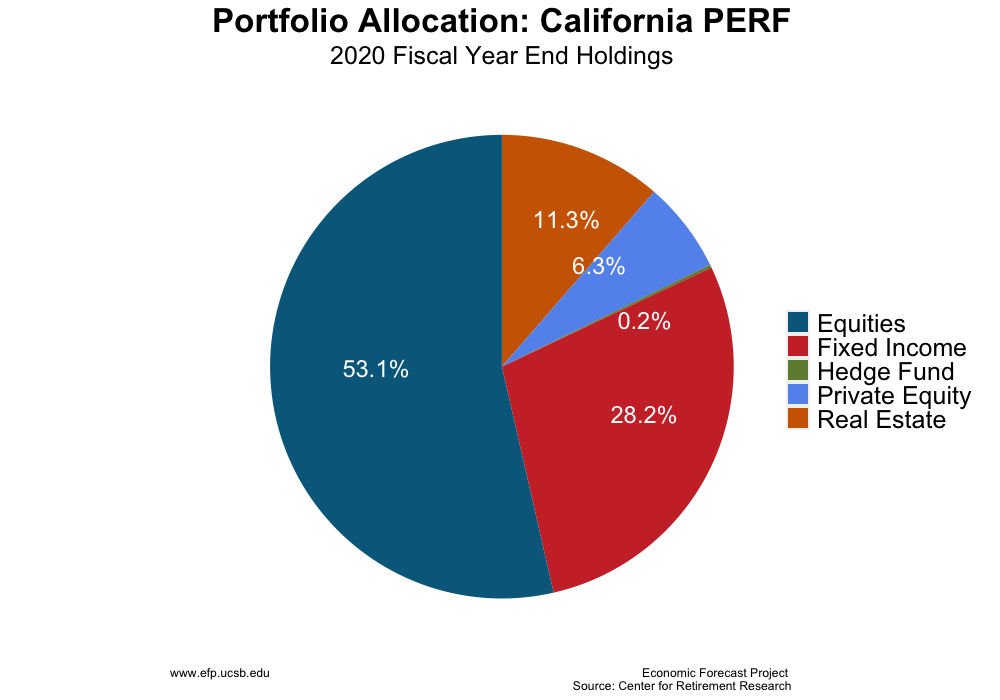 The liabilities data reported by pension funds while informative are misleading. In particular, annual financial reports produced by pension funds follow what are known as the GASB 67 guidelines. A crucial assumption necessary to calculate total pension liabilities is the assumed return of fund assets. The reported data all assume an annual rate of return above 7%. The key flaw in these assumptions is that funds are allowed to implicitly assume that the assets and liabilities of the fund are equally as risky. This is not necessarily the case. The graphs below show the portfolio allocation of each pension fund. The asset mix of all these pension funds is heavily tilted toward equities, which tend to be higher risk assets, as opposed to fixed income. Pension liabilities, on the other hand, are much more certain, i.e. less risky, than suggested by the asset mix of these funds.