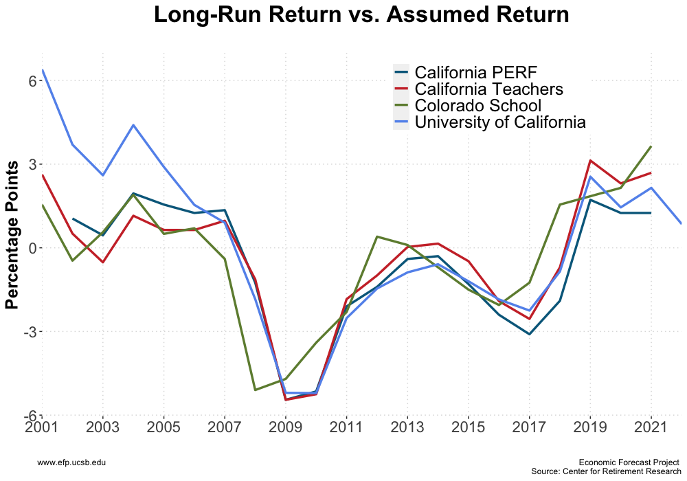 In addition, comparing the long run return to the assumed return can help investors evaluate the performance of their investments. If an investment consistently achieves a return that is lower than the assumed return, investors may want to consider reallocating their investments to other assets or strategies. In 2001, the University of California plan had the highest positive return of 6.04% compared to the assumed return. Since then, the four pension plans tend to rise and decline together, exhibiting a similar trend pattern across time periods. In 2021, the difference between long-run and assumed return for each pension plan is 1.25%, 2.15%, 2.69%, and 3.65% respectively.