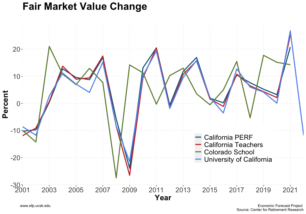 Percent fair value change is a measure that tells us how much the fair value of an asset or liability has changed over a specific period of time, expressed as a percentage of its original value. The percent fair value change of each fund varies widely from year to year. All four pension plans had experienced significant losses in 2008 and 2009 due to the financial crisis. However, they were all able to bounce back to the original level within one to two years. As of 2021, the fair market value change for each pension plan is 20.75%, 26.77%, 25.11%, and 14.3% respectively. These numbers highlight the varying levels of success that each pension plan has had in maintaining or increasing their fair market value. It’s worth noting that there are a variety of factors that can influence the fair value change of an asset or liability, including market conditions, economic factors, and geopolitical events.