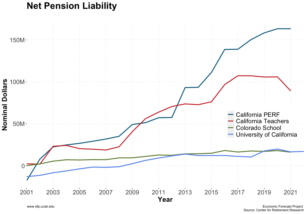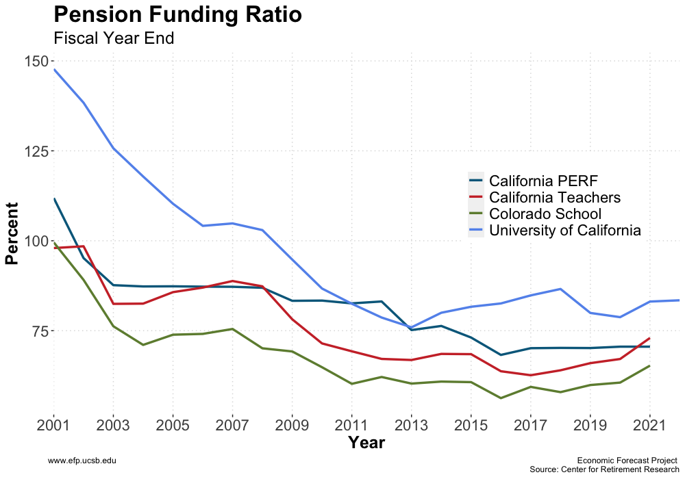 From the perspective of state and local governments, one of the key challenges to balancing budgets is the need to fund pension systems. Three of the largest pension funds that affect our local community are calPERS, calTeachers, and UCRP. The reported total pension liabilities of each pension fund is $329 billion, $139 billion, and $88 billion respectively. Each of these funds reports an unfunded ratio, i.e. fraction of liabilities for which there are insufficient fund assets, of 27.44%, 28.39%, and 20.5%, respectively.