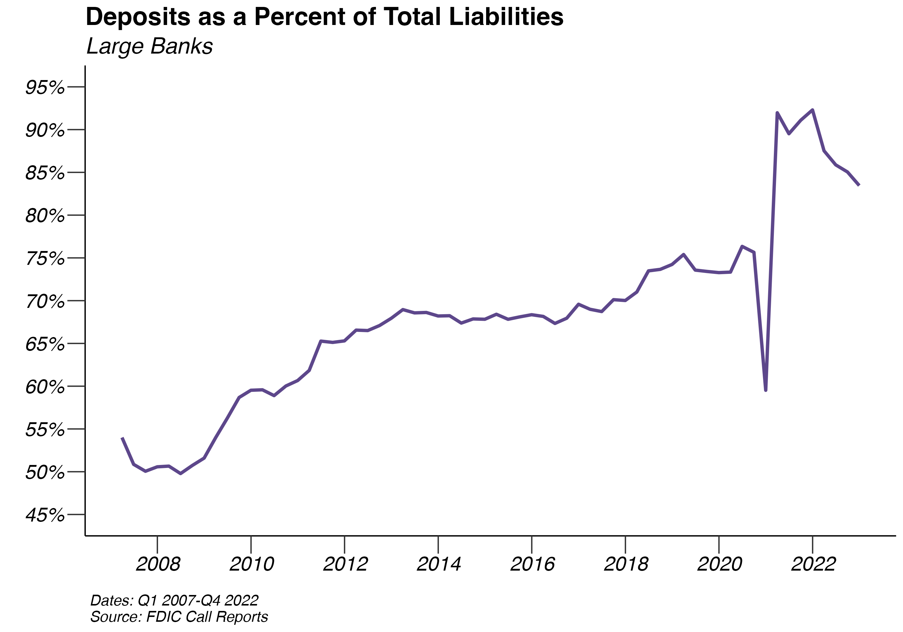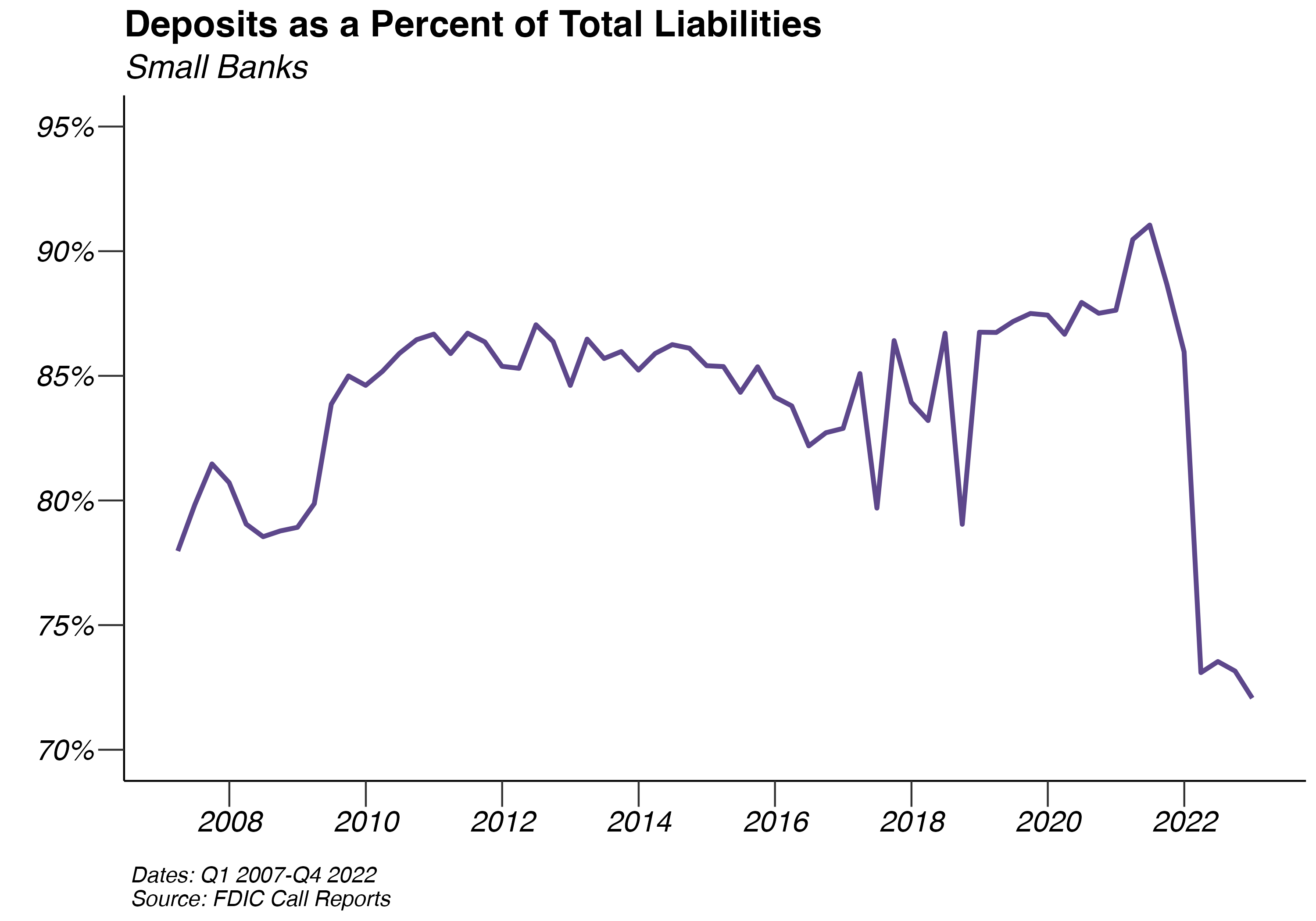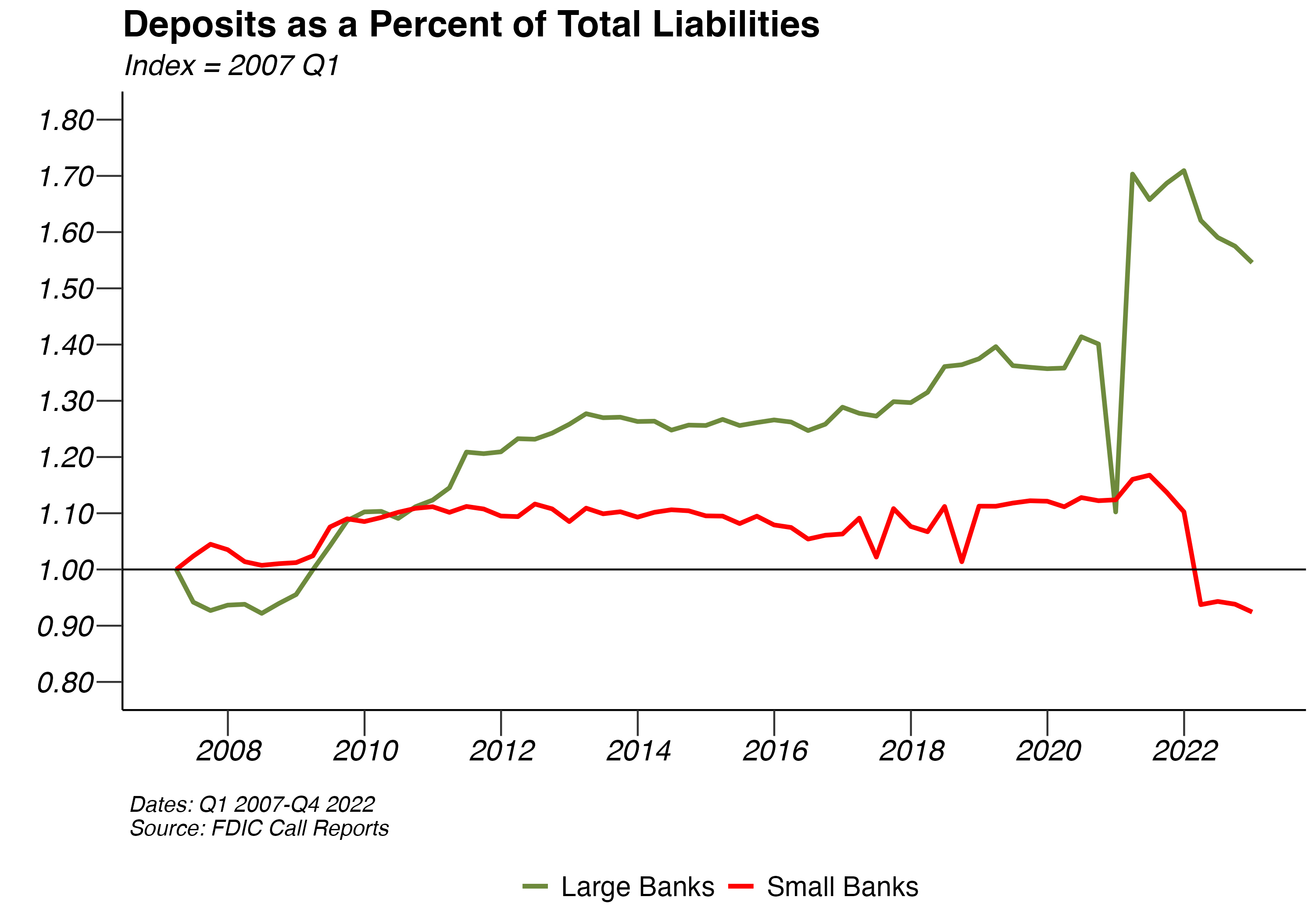 Since the Great Recession, both small and large banks have increased their percent of deposits as a fraction of liabilities. This trend peaked for small regional banks at 91.05% on 06/30/2021, 10.34 percentage points higher than at the end of 2007. Deposits as a fraction of liabilities for large banks peaked at 92.3% on 12/31/2021, 41.73 percentage points higher than it was at the end of 2007.