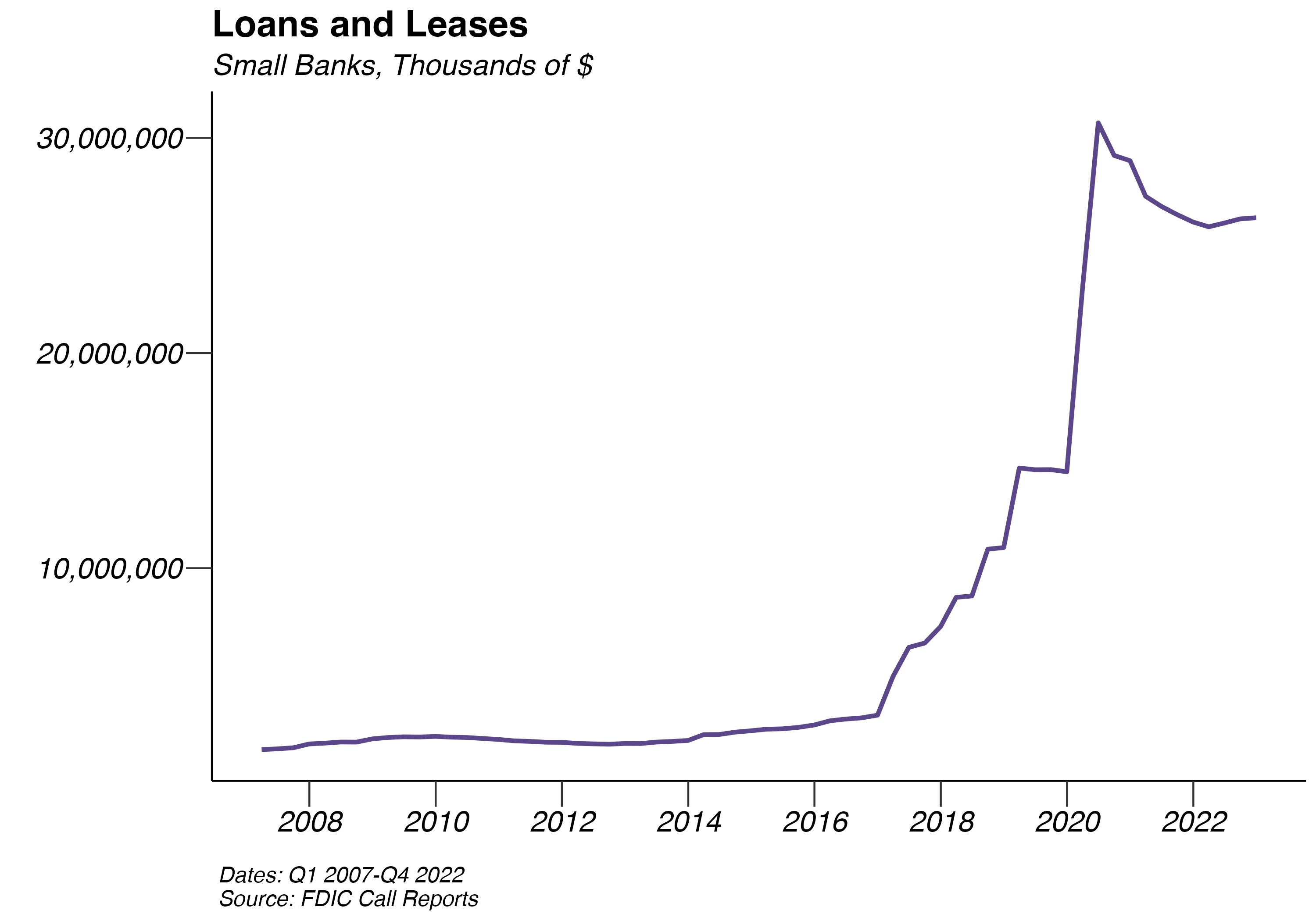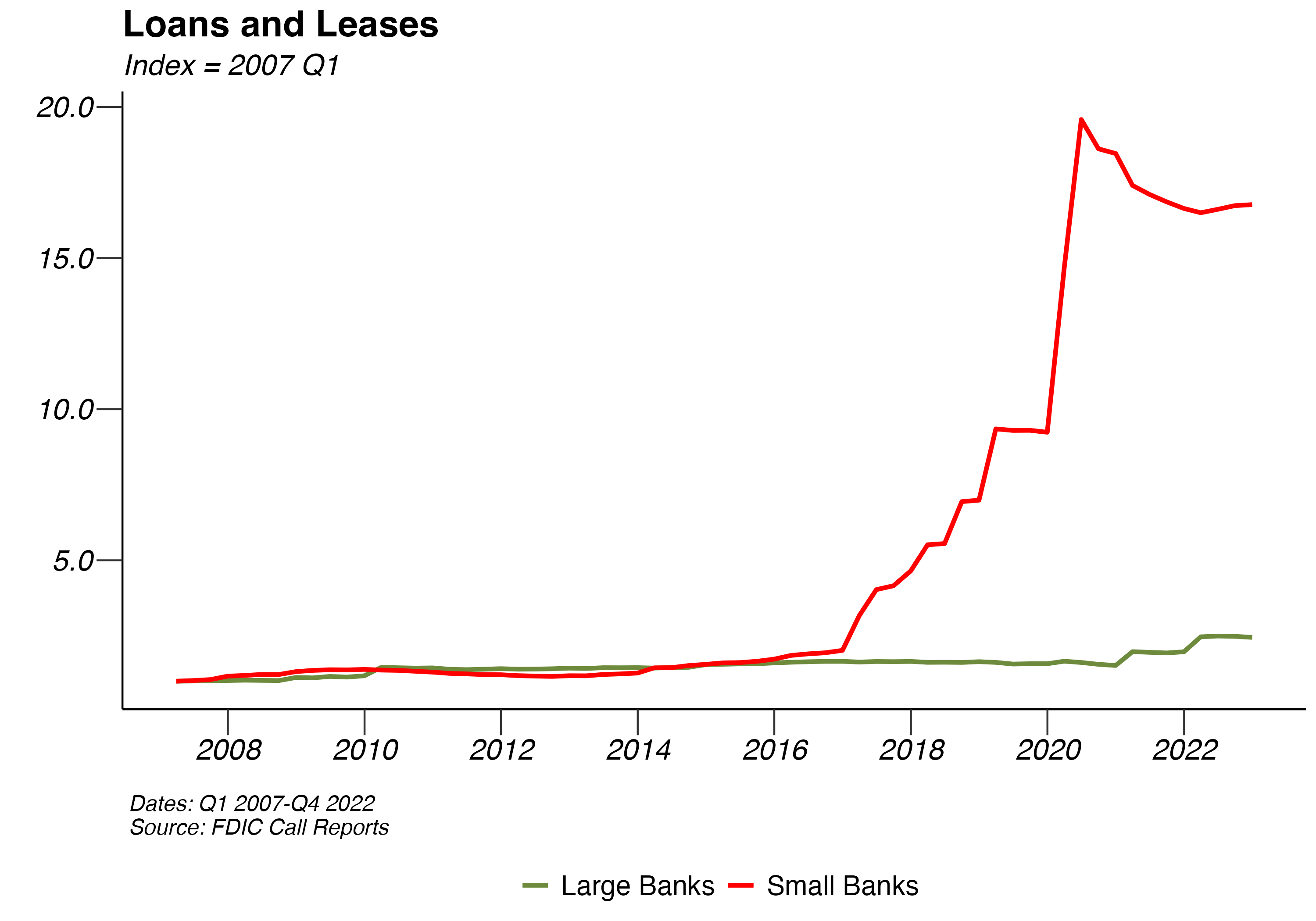 Both small and large banks saw sharp increases in loans throughout 2020, with the COVID-19 pandemic and subsequent quantitative easing policies. Loans have seen some dropoff starting in 2021 for both large and small banks.