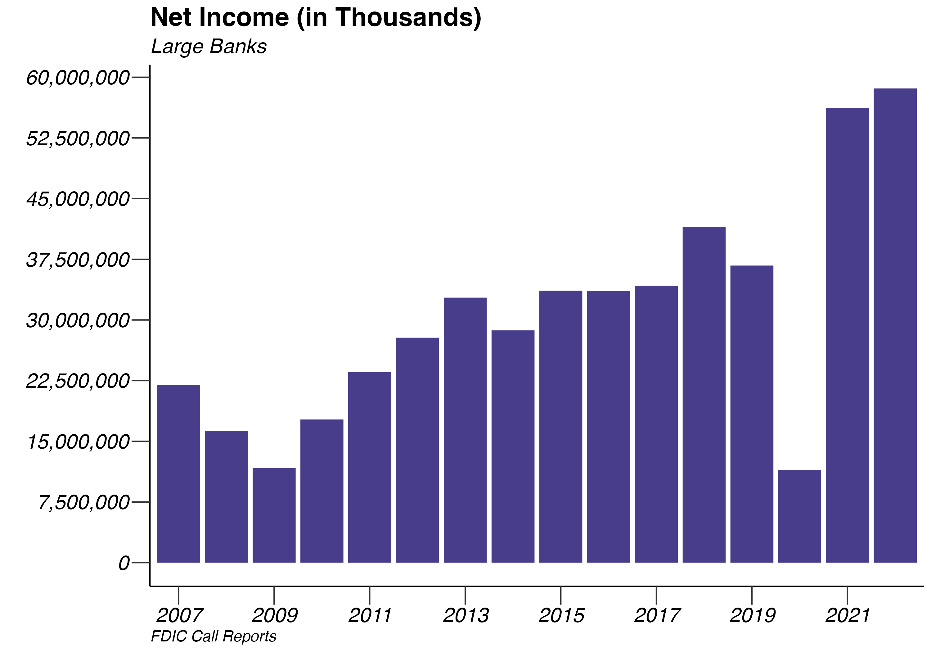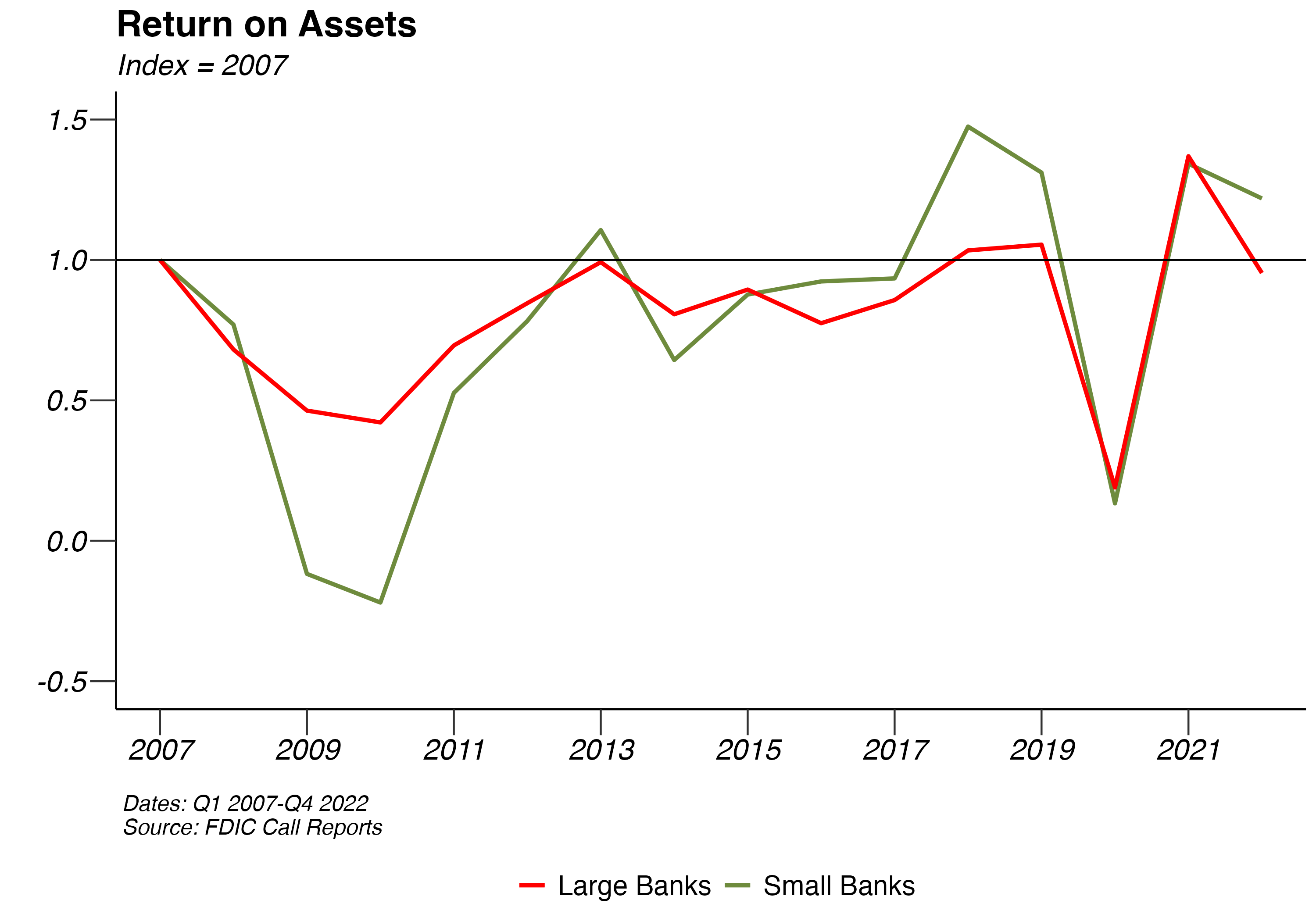 Since the collapse of the financial markets in 2008, banks have experienced a healthy rebound. Although, simply looking at the value of net income does not account for the increase in the size of many banks. In order to take this into account, we divide total net income for the industry in a given year by the industry’s year end total assets to calculate the industry’s Return on Assets (ROA). The ROA graph demonstrates the industry’s return on assets this year compared with that in 2007. Both small and large banks have surpassed their pre-recession levels in 2019. In 2014, the total return on assets for both large and small banks declined, but there appears to be a robust rebound. As of the end of 2022, large banks stand 4.65% lower than 2007 return on assets while small banks are now 21.9% higher than 2007 levels.