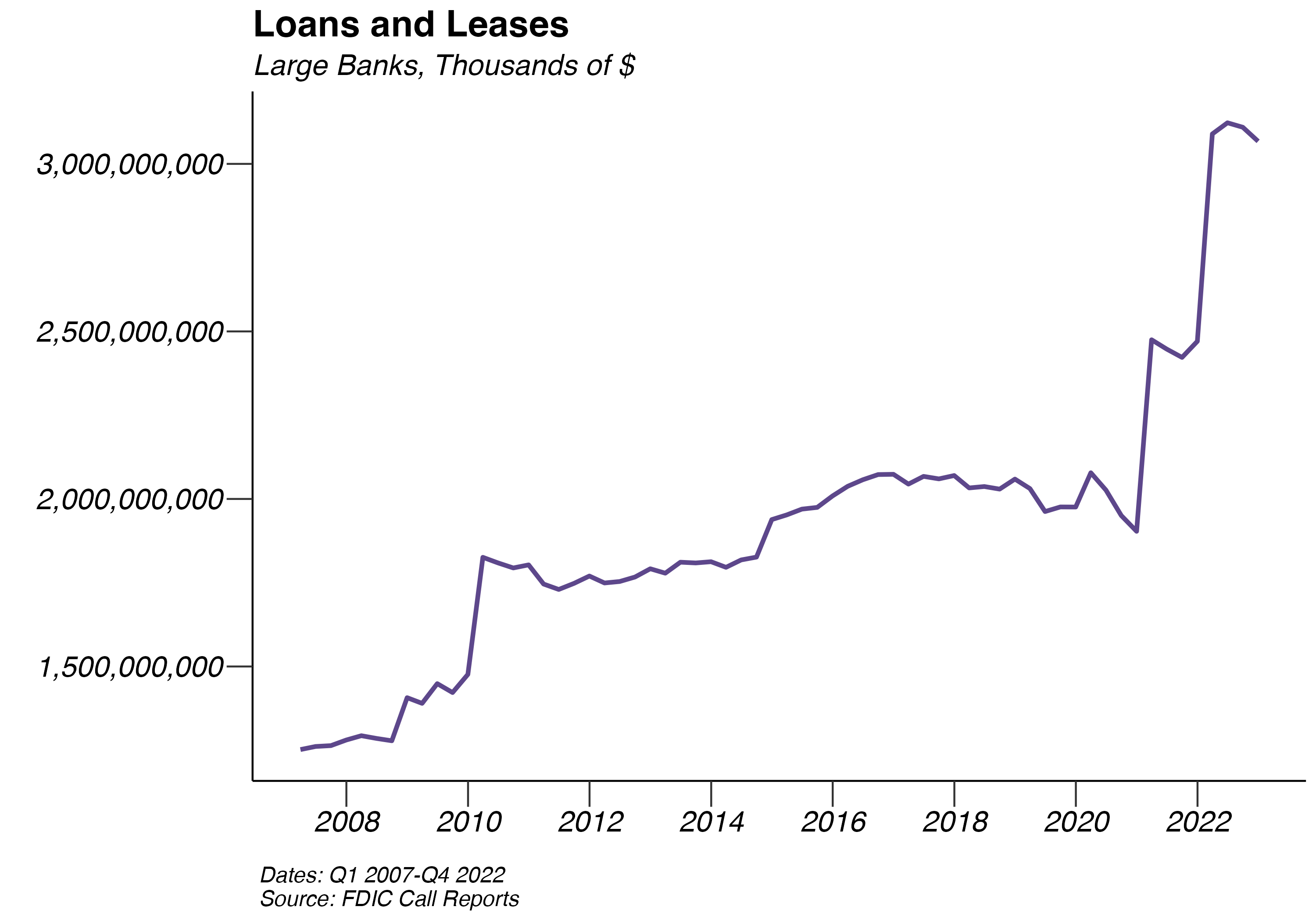 In the past year, loans and leases appear to be trending upwards for large banks, while small banks experience a slow decline following the first quarter of 2019. The average quarterly growth rate for large banks between 12/31/2021 and 12/31/2022 was 5.56%, a decrease from that of 6.74% during the year prior. Since the first quarter of 2007, the average quarterly growth rate of loans and leases for large banks has been 1.43%.