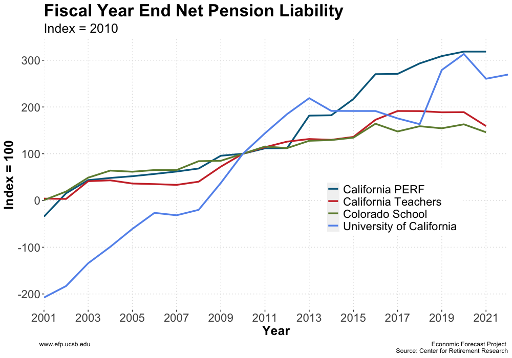 The net pension liability (NPL) is a measure of the difference between the present value of pension benefits earned by employees and the assets available to pay for those benefits. All four pension groups have seen a steady increase in their net pension liability over the years, indicating potential funding challenges in meeting their pension obligations. Since the base year of 2010, the NPL for California PERF, University of California, California Teachers, and Colorado School has increased by 218.49%, 160.45%, 59.18%, and 45.98% respectively, as of 2021. The rise in NPL for California PERF is particularly notable, which can be attributed to a combination of factors, including longer life expectancies, lower investment returns, and changes to actuarial assumptions.