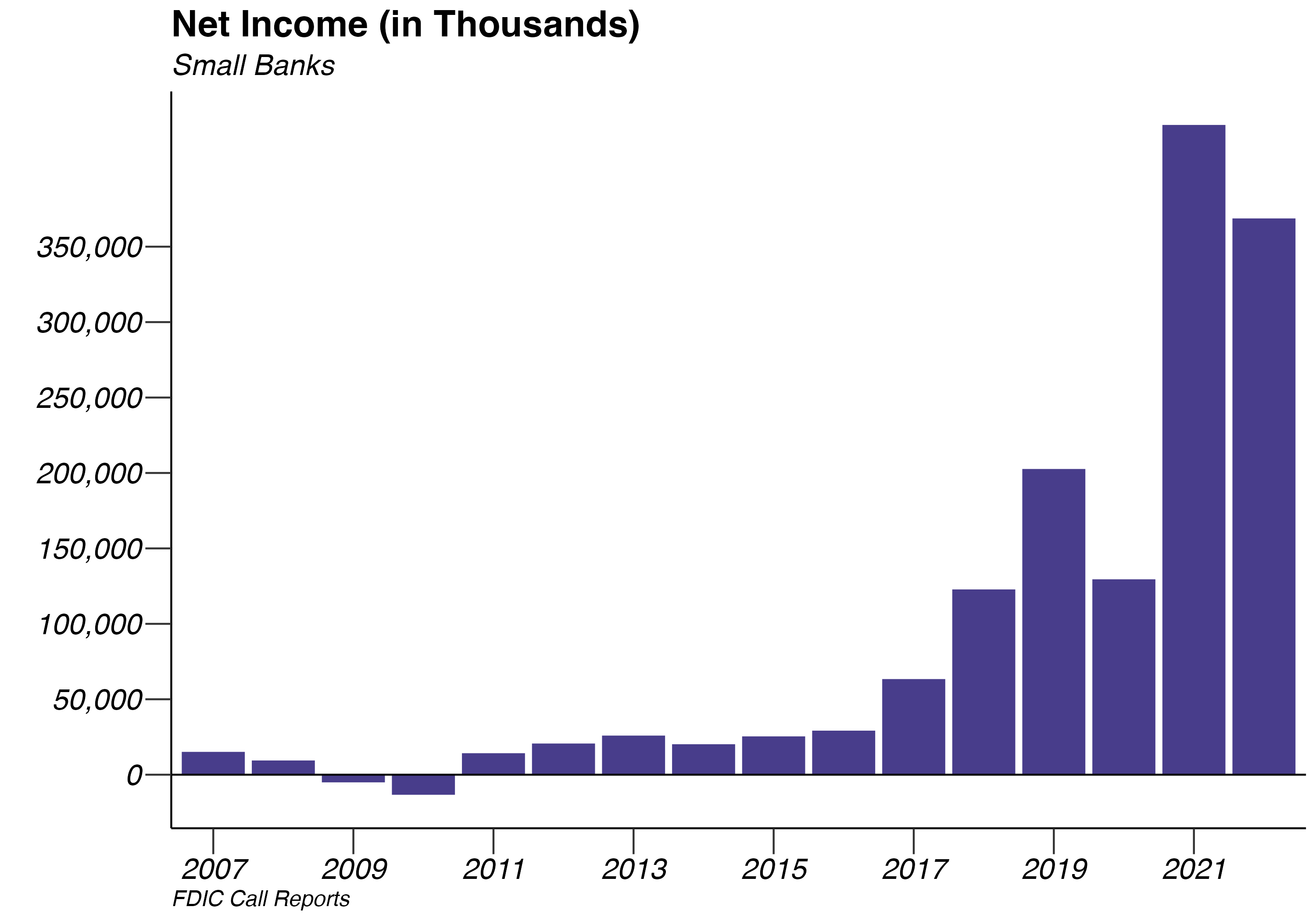 - As of 12/31/2022, small banks’ net income is -12.51% lower than the same time last year.